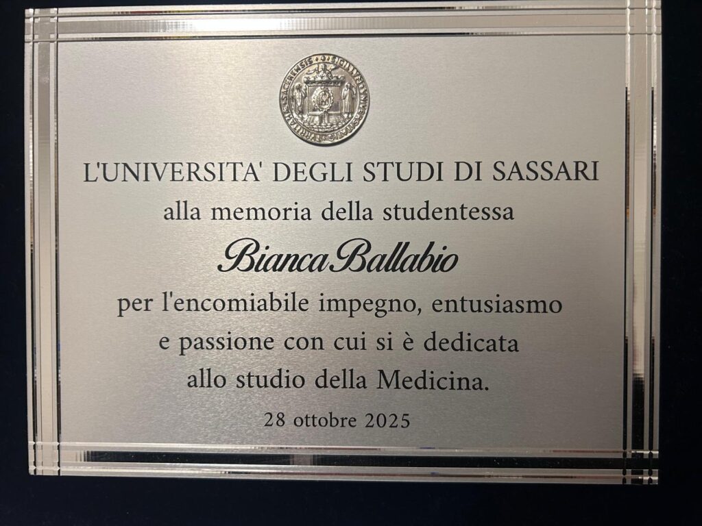 On October 28, 2025, we experienced a deeply moving moment at the University of Sassari. In the presence of the Rector Gavino Mariotti and the faculty, an official plaque bearing the University seal and a certificate of merit in memory of Bianca were presented to her family.
